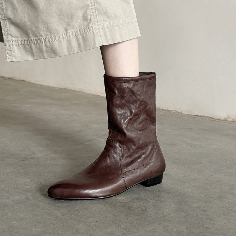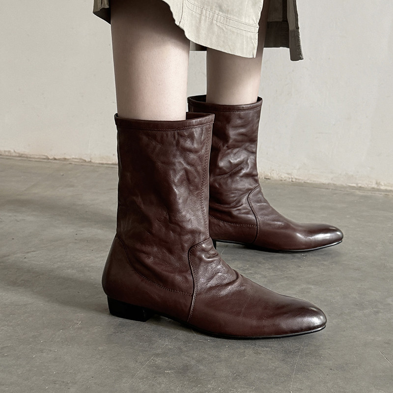 These mid-calf boots are designed for women who appreciate timeless elegance combined with modern structure for autumn and winter wear. Featuring a pointed toe silhouette with subtle pleated detailing, the design delivers a refined and sophisticated appearance suitable for both casual and polished outfits.