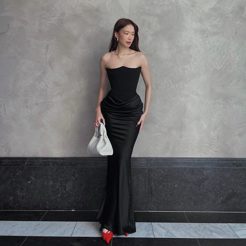 This elegant long dress features a fishbone corseted tube top design with subtle gold accents, inspired by high-end European and American fashion. Perfect for evening events, formal gatherings, and sophisticated occasions.