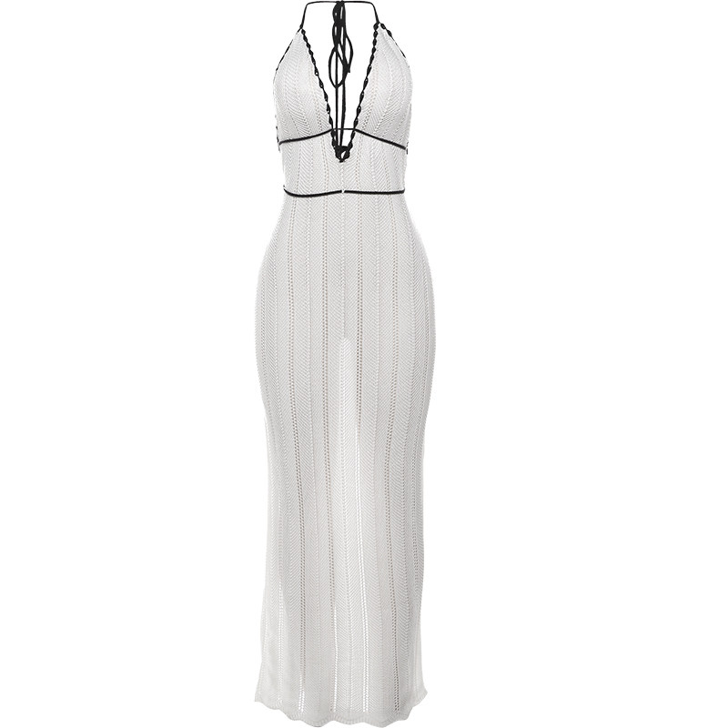 This resort-inspired maxi dress features a halter neckline, black and white contrast design, and a softly defined waist. Crafted from comfortable knit fabric, it is ideal for beach vacations, seaside walks, and relaxed holiday gatherings.