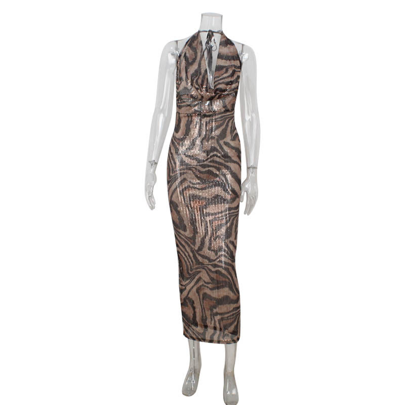 This long dress features a trendy leopard print, halter neckline, and subtle rhinestone embellishments. Inspired by European and American fashion, it offers a modern and stylish silhouette suitable for evening events, parties, and social occasions.