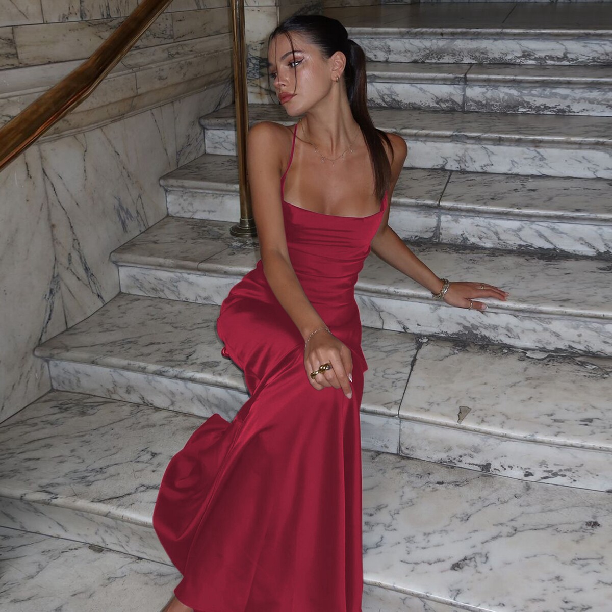 Jaghds | European Style Satin Suspender Dress with Backless Design